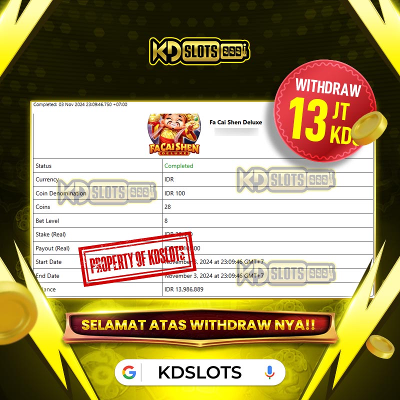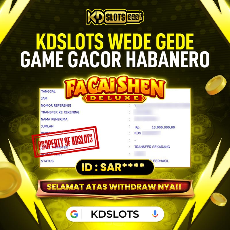 Selamat kepada member KDSLOTS FA CAI SHEN DELUXE user ID SAR**** Telah berhasil mendapatkan kemenangan sebesar Rp 13.000.000 Setelah mengisi formulir withdraw dengan kurung waktu hanya 5 – 10 menit pihak KDslots sudah melakukan transfer kepada pemilik User ID dan dana sudah dapat di cairkan oleh pemenang. Bukti pembayaran yang kami berikan merupakan bukti pembayaran yang SAH / VALID yang langung di dapatkan melaui tanda transfer transaksi dari Bank yang dituju.