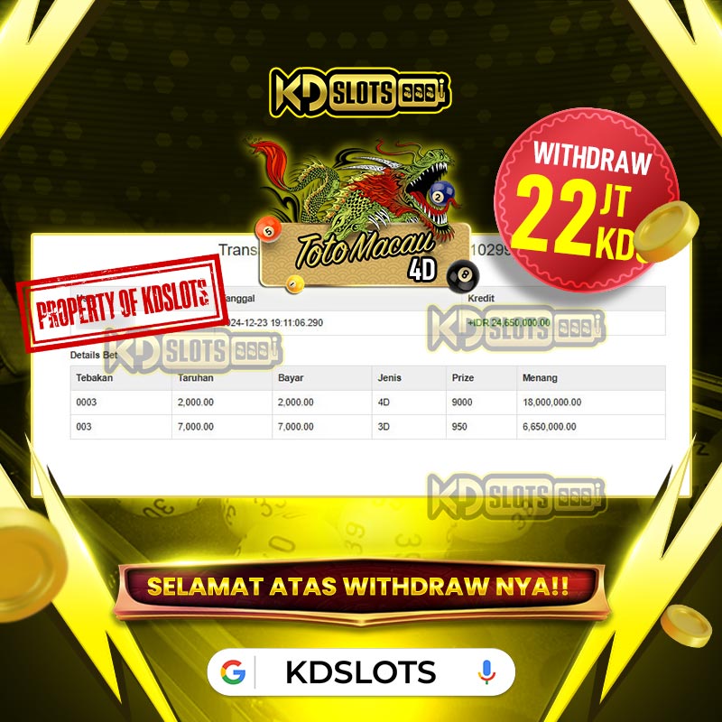 Selamat kepada member KDSLOTS 4D TOTO MACAU (IDN LOTTO) user id BIL**** Telah berhasil mendapatkan kemenangan sebesar Rp 22.000.000 Setelah mengisi formulir withdraw dengan kurung waktu hanya 5 – 10 menit pihak KDslots sudah melakukan transfer kepada pemilik User ID dan dana sudah dapat di cairkan oleh pemenang. Bukti pembayaran yang kami berikan merupakan bukti pembayaran yang SAH / VALID yang langung di dapatkan melalui tanda transfer transaksi dari Bank yang dituju.