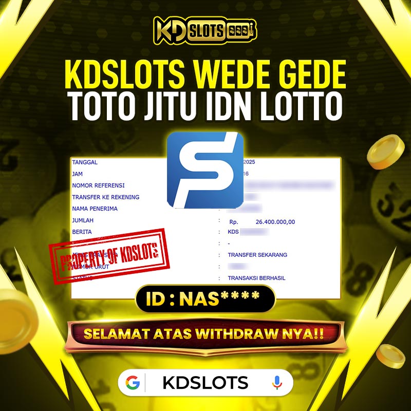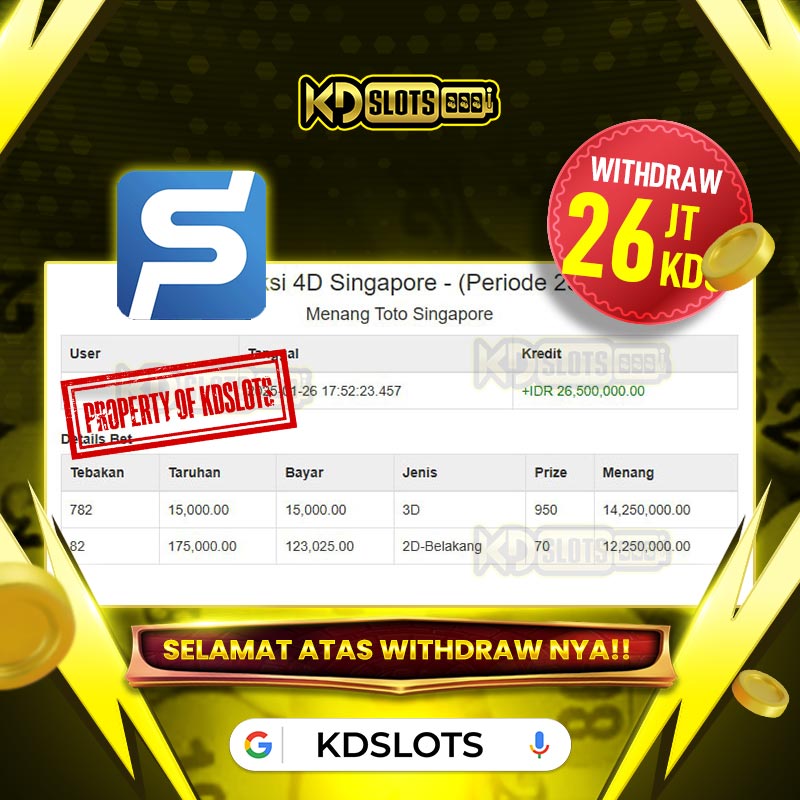 Selamat kepada member KDSLOTS game Singapur (IDN LOTTO) user id NAS**** Telah berhasil mendapatkan kemenangan sebesar Rp 26.400.000 Setelah mengisi formulir withdraw dengan kurung waktu hanya 5 – 10 menit pihak KDslots sudah melakukan transfer kepada pemilik User ID dan dana sudah dapat di cairkan oleh pemenang. Bukti pembayaran yang kami berikan merupakan bukti pembayaran yang SAH / VALID yang langsung di dapatkan melalui tanda transfer transaksi dari Bank yang dituju