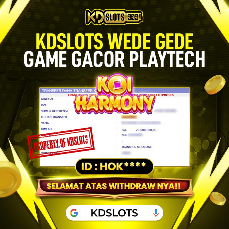 Selamat kepada member KDSLOTS Game KOI HARMONY (playtech) user id HOK***** Telah berhasil mendapatkan kemenangan sebesar Rp 20.000.000 Setelah mengisi formulir withdraw dengan kurang waktu hanya 3 – 5 menit pihak KDslots sudah melakukan transfer kepada pemilik User ID dan dana sudah dapat di cairkan oleh pemenang. Bukti pembayaran yang kami berikan merupakan bukti pembayaran yang SAH / VALID yang langsung di dapatkan melalui tanda transfer transaksi dari Bank yang dituju