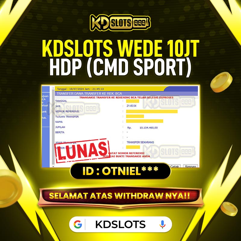 Selamat kepada member KDSLOTS HDP (CMD SPORT) user id OTNIEL*** Telah berhasil mendapatkan kemenangan sebesar Rp 10.104.460 Setelah mengisi formulir withdraw dengan kurung waktu hanya 5 – 10 menit pihak KDslots sudah melakukan transfer kepada pemilik User ID dan dana sudah dapat di cairkan oleh pemenang. Bukti pembayaran yang kami berikan merupakan bukti pembayaran yang SAH / VALID yang langung di dapatkan melaui tanda transfer transaksi dari Bank yang dituju.